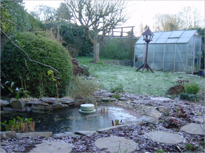 These photos were taken early Boxing day morning when we had, had a little snow and the pond was well frozen. As you can see the Ice Guard is doing it's job of keeping a permanent hole in the ice and providing a refuge for any frogs stupid enough to get caught under the ice. There's not much in the way of wildlife visible in the pond but we have been invaded by the local bird population to feed on the feeders that I have put up.